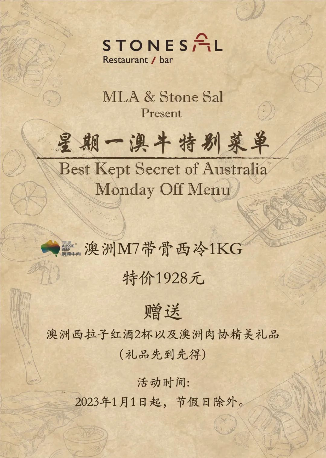 自2023年1月1日起,MLA将继续携手深圳言盐,于每周一推出澳洲牛肉Off Menu套餐。「星期一澳牛特别菜单」包括M7 澳洲带骨西冷1KG和2杯配酒,并有机会赢得MLA准备的精美礼品。希望能让更多食客感受澳洲牛肉的魅力,体验澳洲牛肉所传递的快乐、分享、健康的生活方式。